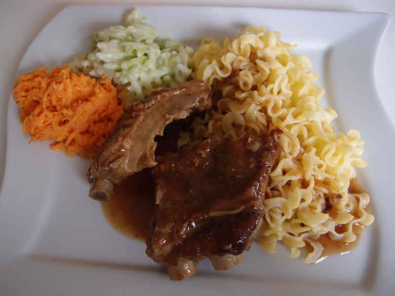 mittwoch geschmorte schälrippchen mit nudeln, gartengurken- und karottensalat