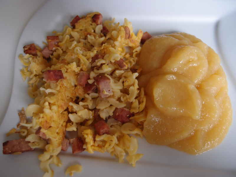 und gestern restnudeln mit fleischkäsewürfeln und ei gebraten. dazu der obligatorische apfelbrei....und heute abend gehen wir sushi essen