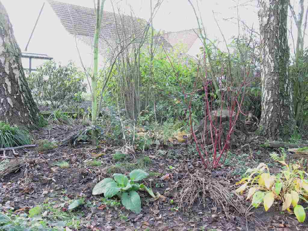 Als Kontrastprogramm stelle ich hier einmal den "Trollschen Birkenhain" vor, der in dieser Form seinen ersten Sommer überstanden hat.In dieser Ecke des Garten befand sich bis zum letzten Winter ein Dickicht aus Reneclaudenaufläufern, Kerrie und Mahoniaaqufolium und anderem unter eben diesen beiden mehr als 30 Jahre alten Sandbirken.Im letzten Winter wurde der größte Teil bis auf wenige Pflaumenstämme und einer Mahonie zwischen den beiden Birken gerodet. Der Boden dazwischen, wurde, soweit möglich aufgebrochen und mit einer dicken Schicht Kompost aufgefüllt.Im Frühjahr habe ich dort den Cornus alba und folgende Stauden gesetzt:Hosta crispula,Hosta lanceifolia,Polygonatum Hybride Weihenstephan,Drypoteris filix-mas,Dryopteris dilatata,Athyrium filix-femina,Carex sylvatica,Carex grayi,Vinca minor und im RandbereichDicentra eximia.Obwohl Vinca und Dicentra nur als lose, wurzelnackte Triebe bzw Rhzome gesetzt wurden, sind alle Pflanzen inzwischen recht gut eingewachsen, Der Aufwand für zusätzliche Wässerung war erstaunlich gering, vielleicht weil wir hier bis August ausreichend und vor allem regelmäßige Niederschläge hatten. Sogar ein im Frühjahr hinter die linke Birke gepflanzter Eibensämling hat offenbar seine Anfangsschwierigkeiten überwunden und ist jetzt im herbst noch einmal durchgetrieben.