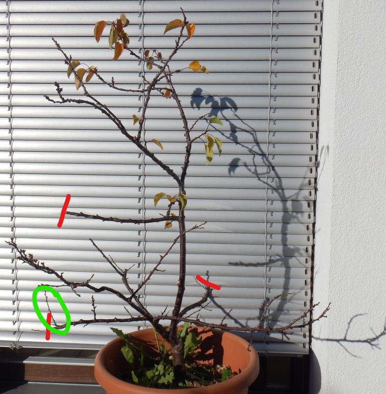 So sieht mein Topfbäumchen aus, Apricompakt (unbek. Sorte auf unbek. Unterlage ...) im 6ten Standjahr. Heuer wurde oberflächlich die Erde erneuert und nach dem Frost an den rot gekennzeichneten Stellen geschnitten. Bis auf den grün eingekreisten Trieb gab es aber keinerlei Neuzuwachs, der Baum stagniert völlig. Mal sehen wie es nächstes Jahr mit der Blütenbildung aussieht, die Früchte sind recht klein schmecken aber sehr gut.