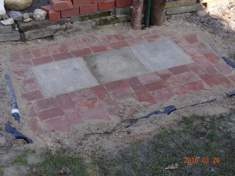 Das ist auch nicht schlecht!Allerdings wollte ich ja unbedingt was Selbstgemachtes. Heute habe ich mal Bilder gemacht. Der Untergrund für den Behälter ist gepflastert. Die Gehwegplatten in der Mitte wird man nicht mehr sehen, wenn der Behälter drauf ist. Sonst hätten mir die Steine nicht gereicht.
