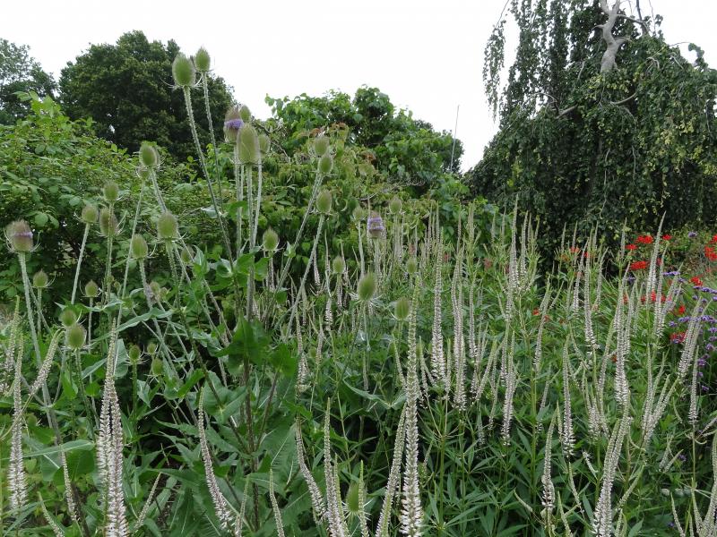 Veronicastrum virginicum 'Alboroseum' in Kombination mit Dipsacus fullonum: