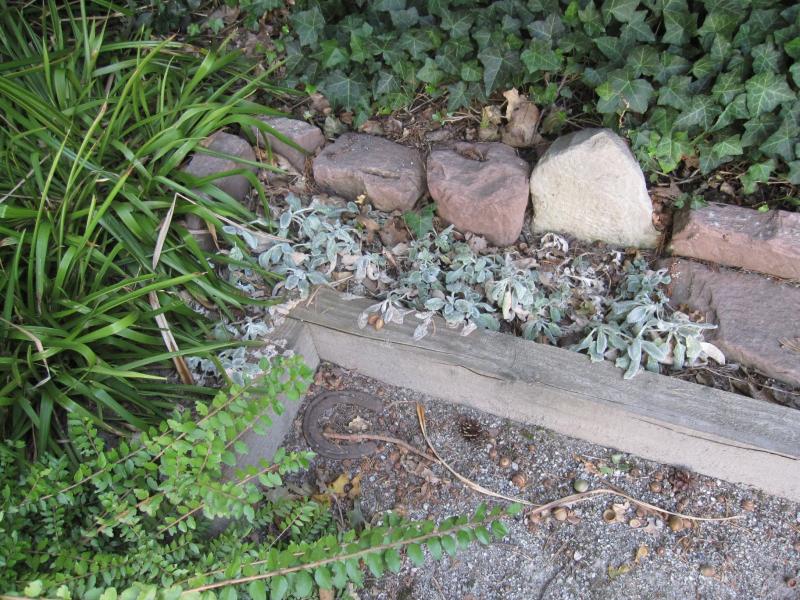 Inzwischen bin ich nicht mehr so überzeugt, von meiner Idee. Hier die Stachys im Vergleich zum banalen Efeu. Beide nicht gewässert.