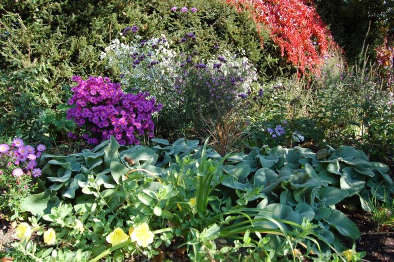 Das riesige Grün ist Aster novae-angliae 'Herbstschnee', nur ein Teilstück, aber hui, die hat losgelegt! Vorne sieht man die Chrysantheme 'Hebe' von Sandbiene :D