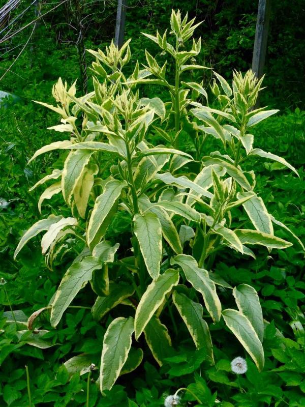 Na ja - meiner ist im dritten Jahr gut 1 m breit mit 8 Stängeln von Mannshöhe. Die Blüten sind im Verhältnis zum panaschierten laub eher unscheinbar: