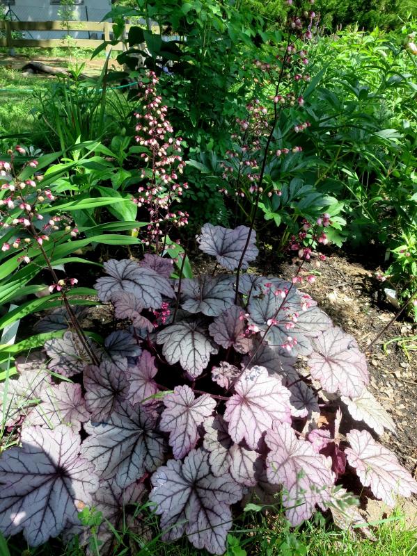 Richtig wohl im Sandboden fühlt sich die Heuchera 'Sweet Plum', auch am ganz überwiegend sonnigen Standort.