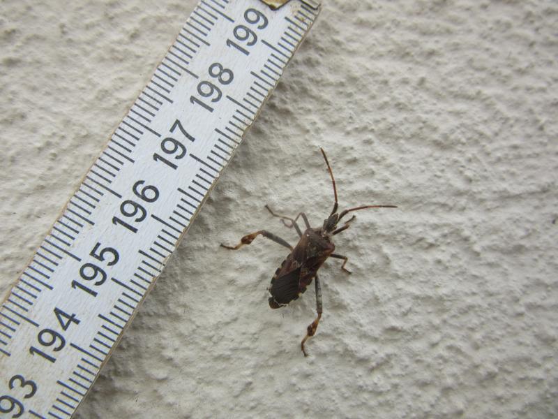 Kiefern-Wanze (oder Zapfenwanze, RosaRot war schneller ;) ). Sehr charakteristisch die geflügelten Partien am hinteren Beinpaar. Besonders ist, dass sie Süd- und Mitteleuropa in wenigen Jahren erobert hat. In den Fenstern und an Hauswänden ist sie jetzt eine der häufigsten. Vor 15 Jahren, als ich mir Wanzen eine Zeit lang näher angesehen hatte, habe ich sie nie gesehen. Sie stammt aus Nordamerika.