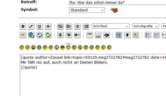 Hausgeist hat geschrieben: 15. Sep 2016, 17:34... heute wieder normal die Smileys sind wieder (geringfügig) größer und nicht mehr unscharf.