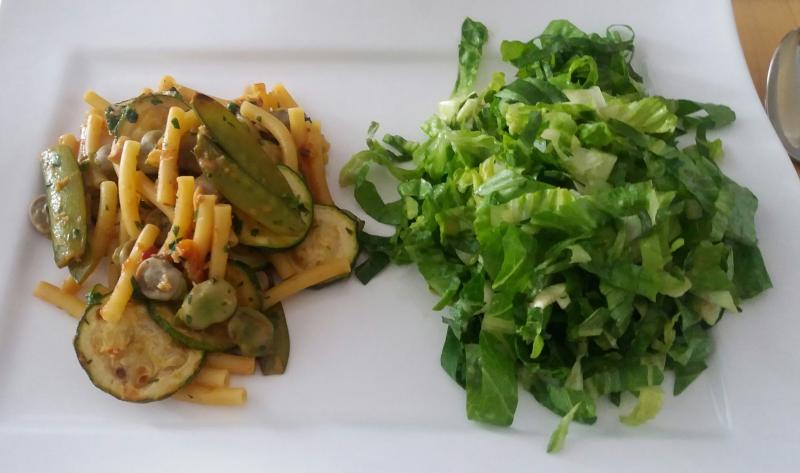 ;Dein zweisprachiges Essen. Bei mir gibt es Nudeln mit Hackfleisch-Gemüsesugo (viiiiel Tomate, Zuchini, Aubergine, Karotte, Zwiebel und Knobi, gewürzt mit Rosmarin, Thymian, Bohnenkraut, Basilikumblüten, Pastinakensamenstand, Petersiliensamenstand, Chili..)Gröstl mit Frikadellen