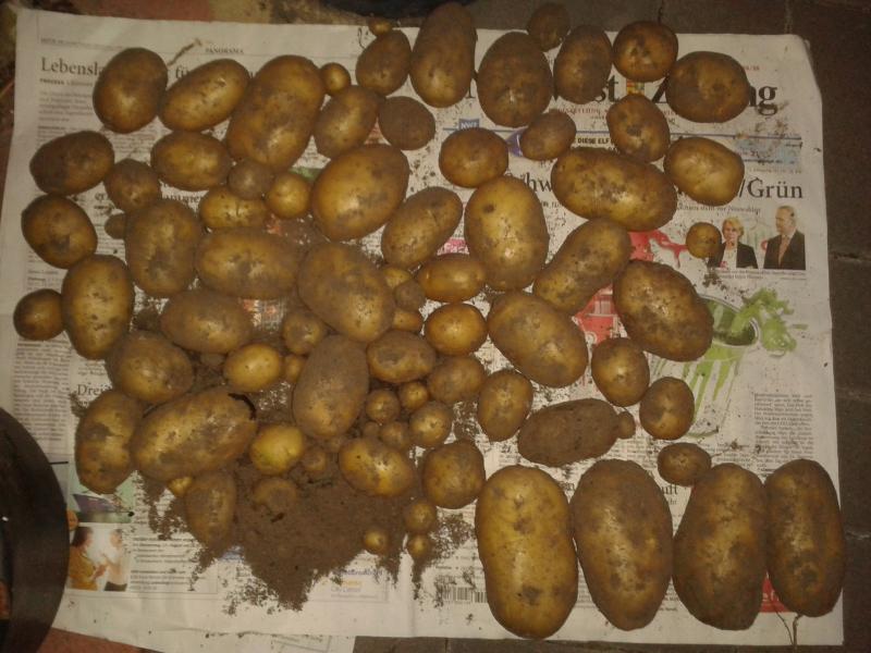 Nachdem das Laub - nach vorheriger erfolgreicher Reduzierung durch die Schleimer :-X - nun vertrocknet ist, begann am letzten Samstag die Ernte. Am kommenden WE sollen die restlichen aus der Erde.