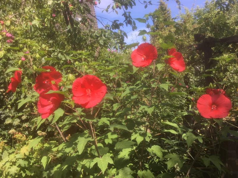 Hibiscus moscheutos hatte ich vor Jahren aus Samen gezogen. Eine der Pflanzen ist bis heute treu. Die Teilstücke kommen bei sommerlich nasser Haltung in größeren Kübeln und Wasserspeicher im Übertopf ab August/September in Blüte und wachsen bei halbwegs ordentlicher Düngung auch gut.