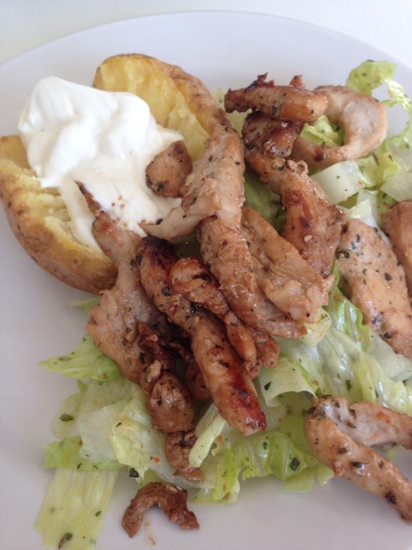 Vorgestern gabs ofenkartoffel mit Quark, Hähnchenbruststreifen und Salat