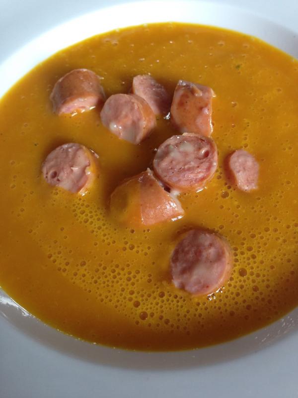 Gartenkürbissuppe mit Käsewürstchen und Baguette