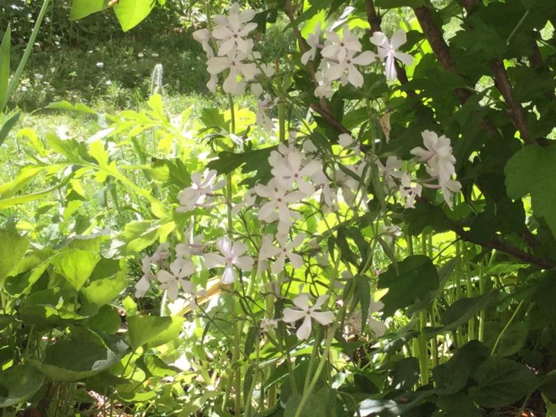 Phlox divaricata 'White Perfume'. Ein zweijähriger Steckling. Schon fast verblüht und ein bisschen Hagelgeschädigt.