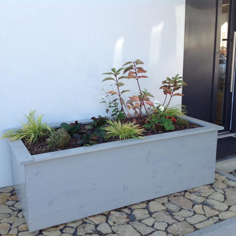 Na klar. Drin sind jetzt hydrangea wims red, drei hakonechloa, drei Bergenia herbstblüte, zwei Anemone whirlwind, zwei Geranium rozanne ( zurückgeschnitten), und dazwischen hab ich narcissus Mount hood, hyacinthoides non scripta, chionodoxa.