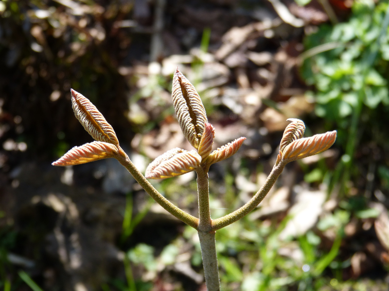 Der Austrieb von Zanthoxylum piperitum - purple leaved sieht schon sehr vielversprechend aus.