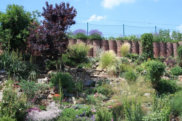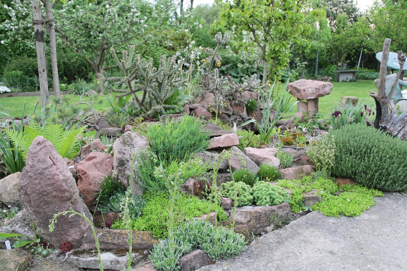 ich habe einen Lärmschutzwall mit mehreren kleinen Trockenmauern und Terrassen zu einem Steingarten umgestaltet.