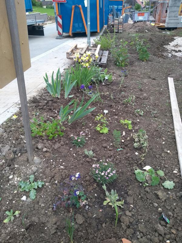 So, hier mal ein Bild von der aktuellen Lage vor dem Haus, wo jetzt Dank einer Pflanzenspende schon ganz schön viel wächst, etwas durcheinander, aber ich freue mich trotzdem sehr darüber.