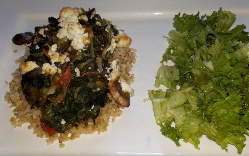 Guter Heinrich mit Champignons und Tomaten, mit Schafskäse überbacken auf Bulgur. Dazu Salat.