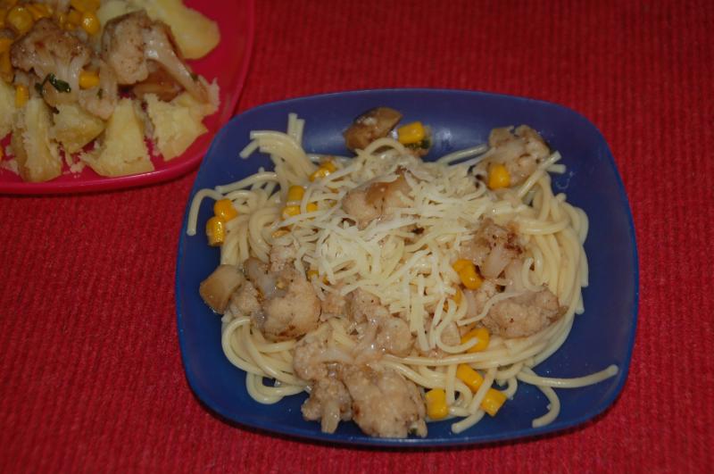 Spaghetti mit Blumenkohl, Mais, Oregano und geraspeltem Emmentaler