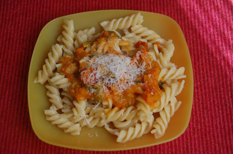 Essen 1: Spirellen mit Tomatensoße (Tomaten, Frühlingszwiebel, Currypulver, Salz, Kubebenpfeffer) und Parmesan
