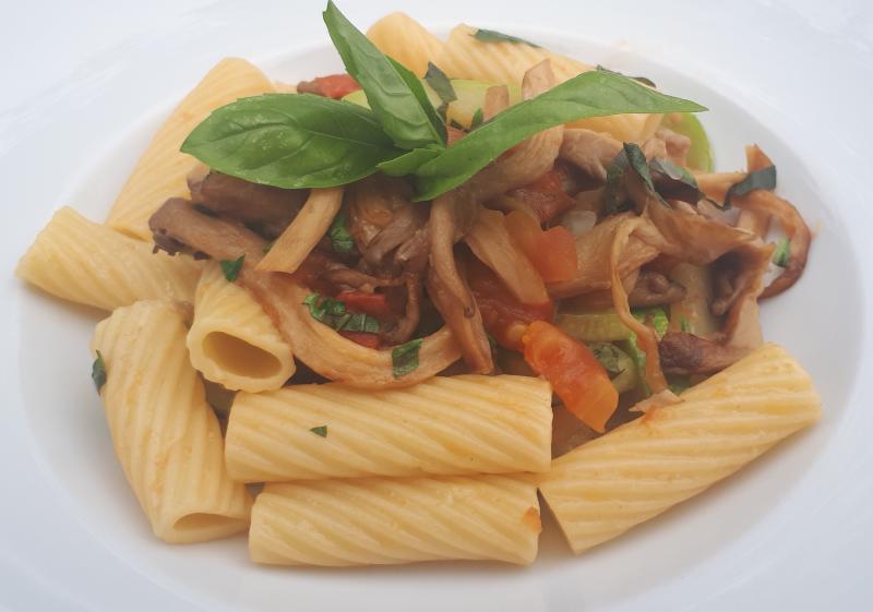 Pasta mit Zucchini, Austernpilzen, Tomaten und Basilikum,