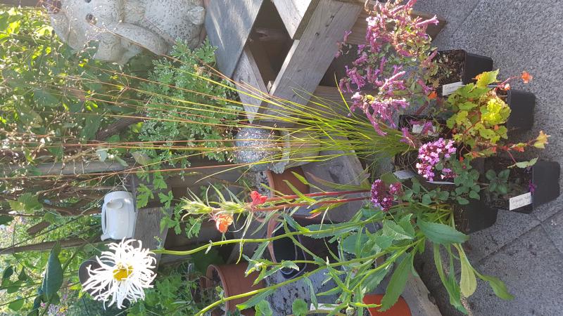 Dazu kam noch 2 Oregano Sorten, ein chices , duftendes Gras und eine Nachtkerze in orange/ rot.