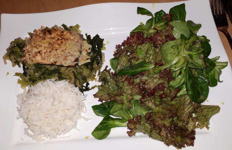 Heute gab es Feldsalat mit Garten- Lollo rosso, Basmati, Wirsing undTofu, gratiniert mit Käse und Nüssen