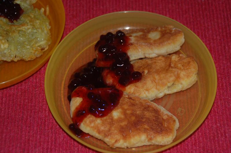 Heute gab es Quarkkeulchen (Quark, Mehl, Ei, Butter, Zitronensaft, Zucker, Salz, Backpulver) bzw Reibeküchlein (Kartoffel, Ei, Salz, Kartoffelstärke) mit Preiselbeeren+Quittengelee.