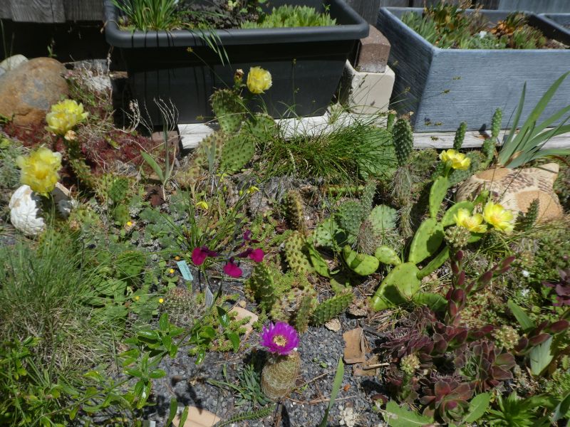 Zur Zeit ist das Kakteenbeet richtig voll mit Blüten. Alleine die Opuntien werden noch einige Zeit brauchen. Die Delosperma blühen vor allem schön dieses Jahr.