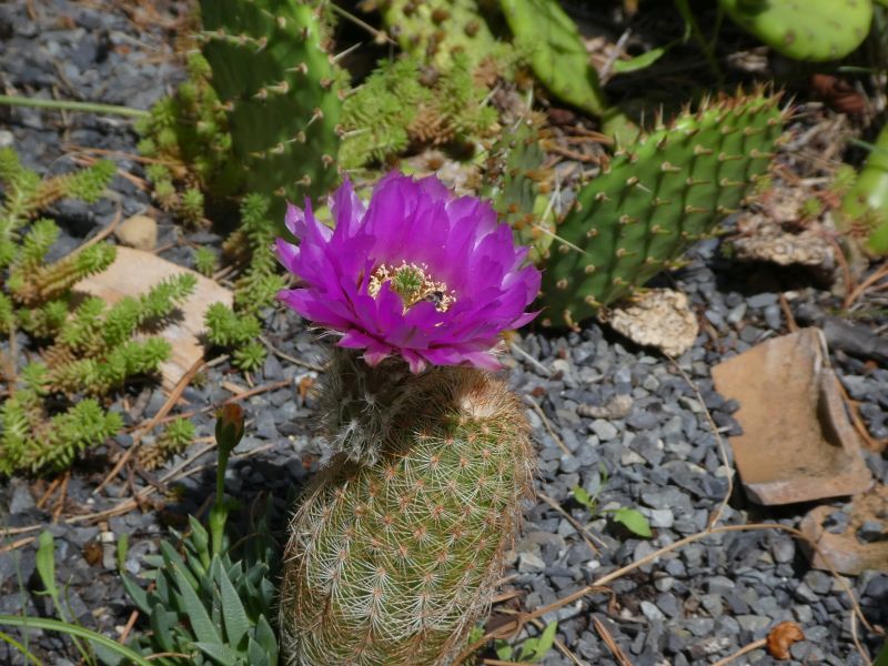 Jetzt ist Echinocereus reichenbachii aufgegangen. Ich bin begeistert. Ich habe ihn im vergangenen Herbst auf dem Staudenmarkt gekauft. Im Winter sah er erbärmlich aus, ich wartete ständig darauf, dass er umfiel. Das tat er aber nicht. Er hatte seit Herbst etwas knospenartiges, und es tat sich lange nichts. Bis sich die Knospe plötzlich streckte und füllte. Voilà!