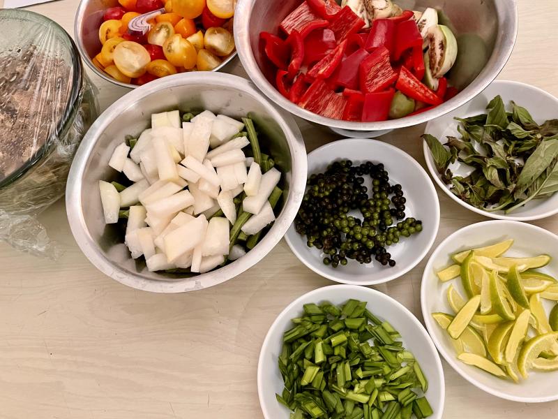 vorgebratener und dann marinierter bio-schweinenacken mit gemüse, grünem thai-curry und sojasauce, mal ohne kokosmilch