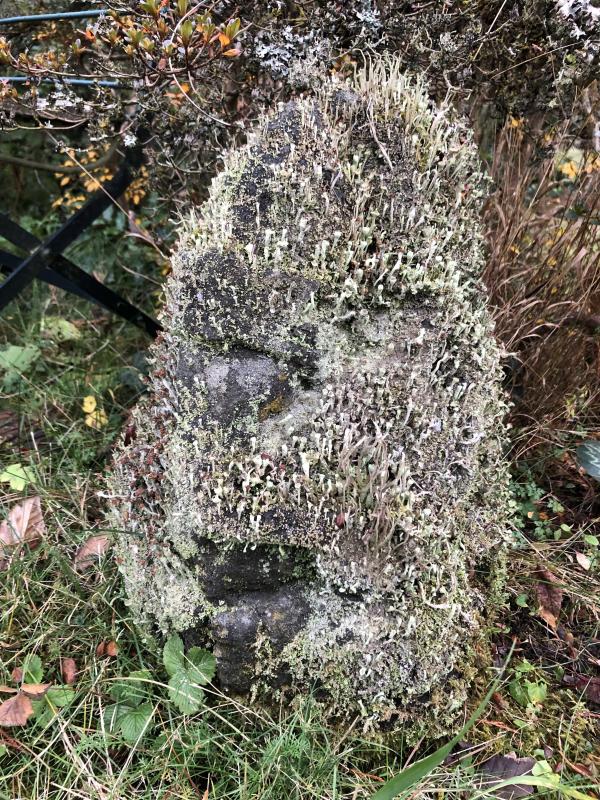 Eine Steinfigur ist über und über mit diesen trompetenartigen Flechten überzogen.