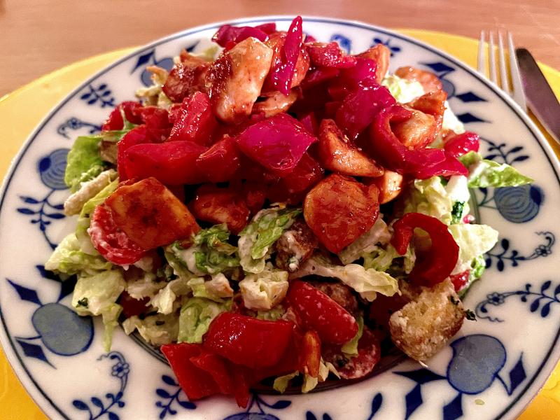 hier heute eine etwas sehr opulente ceasar's salad-variante mit hausgemachten toast-croutons mit petersilie, süßem chili-huhn und spitzpaprikastreifen