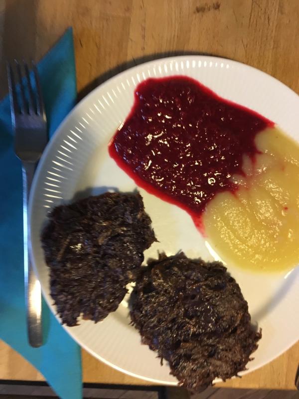 Schauen zwar verbrannt aus, sind sie aber nicht, sondern Puffer aus violetten Erdäpfeln. Bastelkönigs Großmutter würde sie nicht wieder erkennen, aber ich hab mich genau an ihr Rezept „Gubener Kartoffelpuffer“ gehalten. ;) Dazu gab es Apfelmus aus dem Glas und selbstgemachte Weichselsauce.