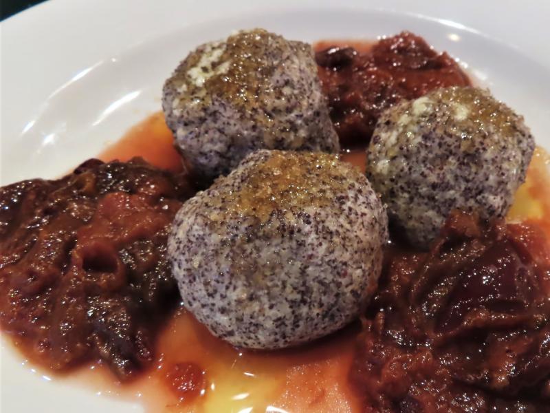 Hier gab es Dezembersamstagessen: Sauerkrautsuppe aus Restsauerkraut vom Donnerstag, mit Speck gerösteten Zwiebeln, Paprika und geriebener Kartoffel, Klecks Sauerrahm; danach Topfenmohnknödl mit Zwetschkenröster. Irgendwie ein Knödlzentrum grade ;D