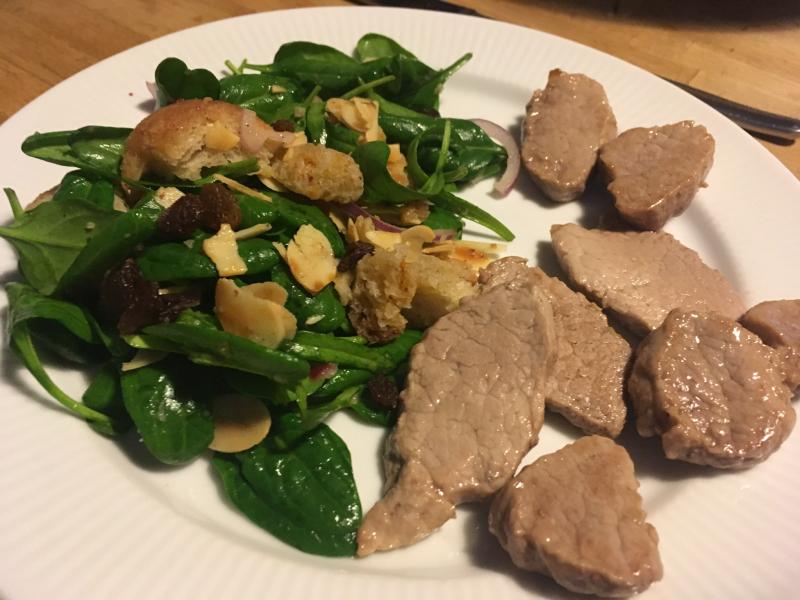 Nachdem gestern Spinat im Gemüsekistl war, habe ich im neuen Jerusalem-Kochbuch geblättert und daraus einen Salat gemacht. Statt Datteln habe ich Rosinen und statt Pitabrot italienisches Weißbrot genommen. Ansonsten mit roten Zwiebeln, Mandeln, Sumach, Chili, Salz, Zitronensaft, Olivenöl, Butter, Essig.