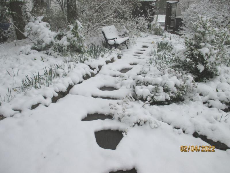 Leider ist der Schnee schwer und pappig, viele schöne Narzissenblütenstiele sind abgeknickt, besonders bei den zarteren Thalias, die gerade erst mit der Blüte begonnen haben.