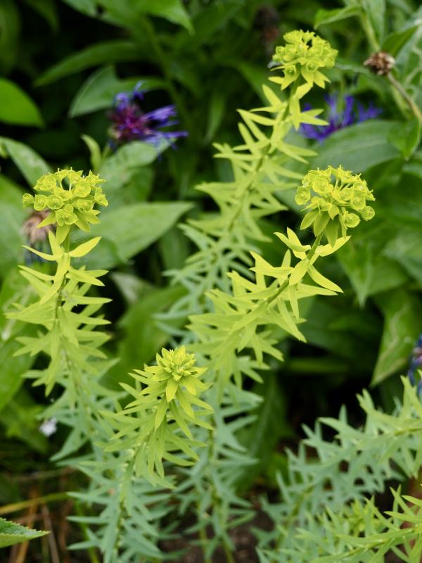 Und dann blüht noch ein Neuankömmling. Euphorbia niciciana. Ich mag die frische Farbe. Hier mit Bergflockenblume im Hintergrund.