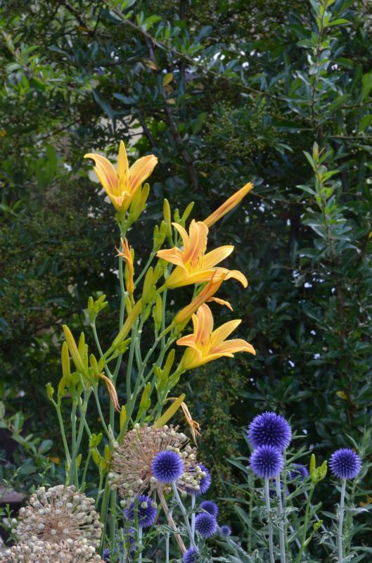 Genau deswegen musste sie hier auch einziehen! Im ersten war ich enttäuscht, versteckte sich hinter den Echinops, die sie eigentlich überragen sollte. Letztes Jahr schon ganz gut, in diesem Jahr so, wie ich es geplant hatte. Und trotz des eigentlich nicht so tollen Platzes vor den Sträuchern auch ganz ordentlich bestückt.