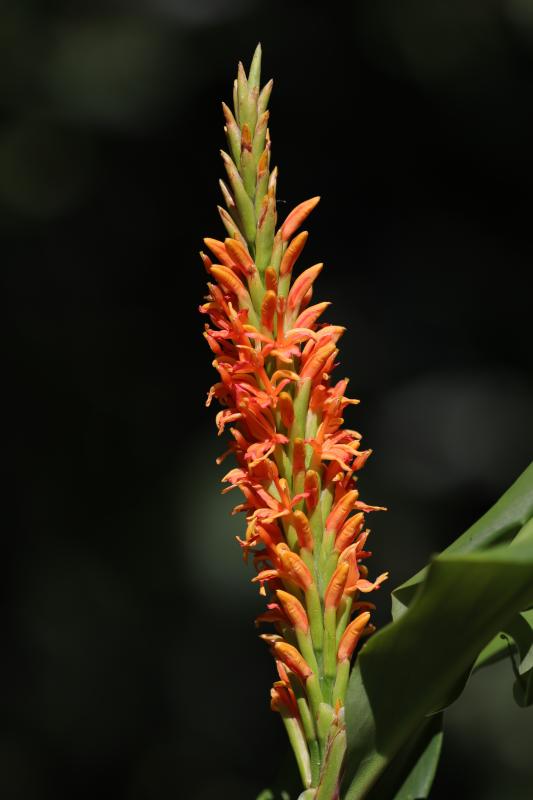 Zierlicher, aber nicht weniger farbkräftig: Hedychium densiflorum ´Assam Orange´. Diese Auslese blüht immer deutlich später als eine andere, die blasser lachsfarben ist und hier noch nie Saat ansetzte, im Gegensatz zu dieser Sorte.