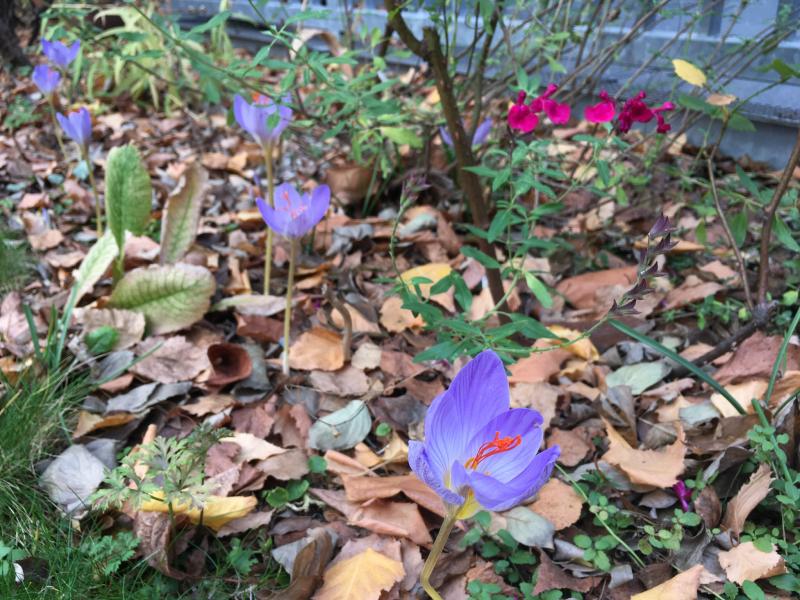 Frisch gepflanzte Crocus speciosus, deswegen ein bisschen verspätet. Salvia greggii Raspberry Royale hat immer noch ein paar Blüten.