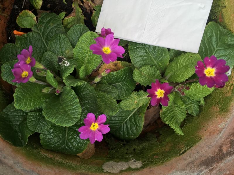Hier dürfen die Primeln bunt durcheinander wachsen, und dank Lehmboden blühen sie jedes Jahr reichlich und stecken auch knochentrockene Sommer ziemlich gut weg. Viele von ihnen stehen wahrscheinlich schon seit Jahrzehnten im Garten, einst von meiner Oma gepflanzt, oder sie haben sich selbst irgendwann ausgesät, so wie diese hier neben den (von mir gepflanzten) Cyclamen und dem Arum.