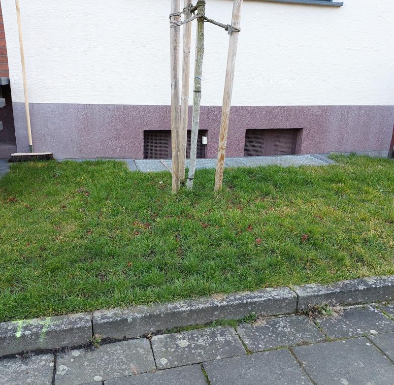 Gegenüber uns hat man vorne einen Teil der Betonplatten weggeholt. Nun ist dort eine kleine, ungepflegte Rasenfläche. Mittenmang ein Baum. Zumindest im Sommer mit etwas Farbe. Hunderte Löwenzahn......