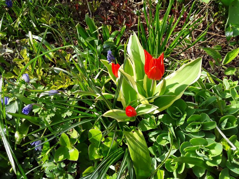 Tulipa kaufmanniana 'Scarlet Baby' - Aubrieta 'Blue Blush Bicolour' - Primula rosea