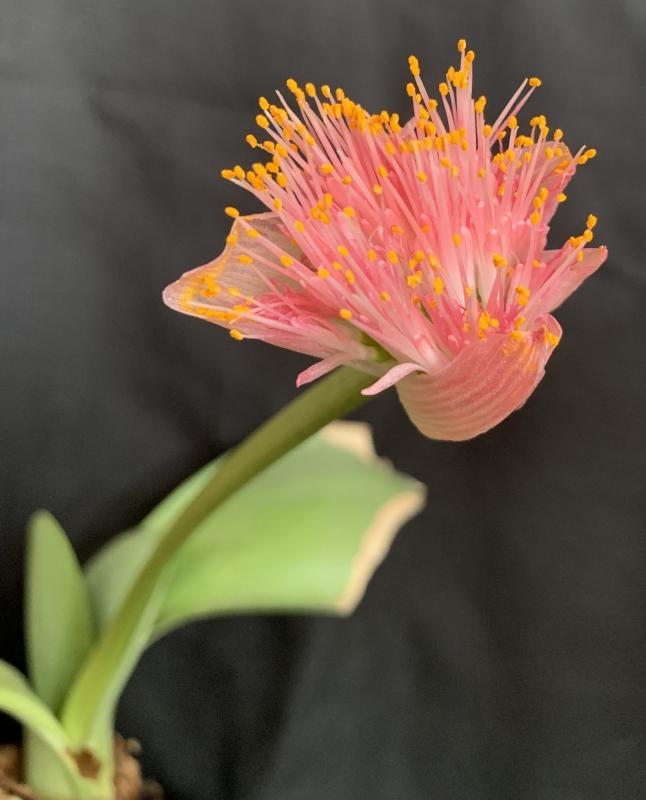 Die im letzten Jahr schon gezeigte Haemanthus-Hybride hat nun einen etwas größeren Blütenstand. Erinnert sehr an rosa H. albiflos. Die Blätter wachsen auch ähnlich, sind aber weicher und nicht so dauerhaft (leider auch anfällig für Thrips).