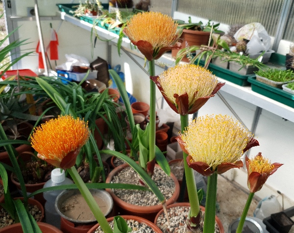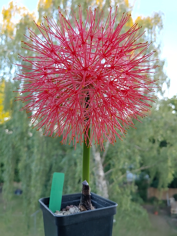 Aktuell blühen bei mir einige Scadoxus puniceus. Ich habe diese Pflanzen vor 10 Jahren als erbsengroße Sämlinge erhalten.