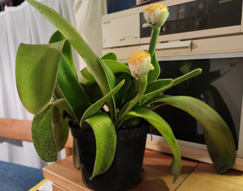 Vielleicht nichts besonderes, aber für mich Premiere: mit Übersommerung auf dem Balkon eine erste Blüte von Haemanthus albiflos.
