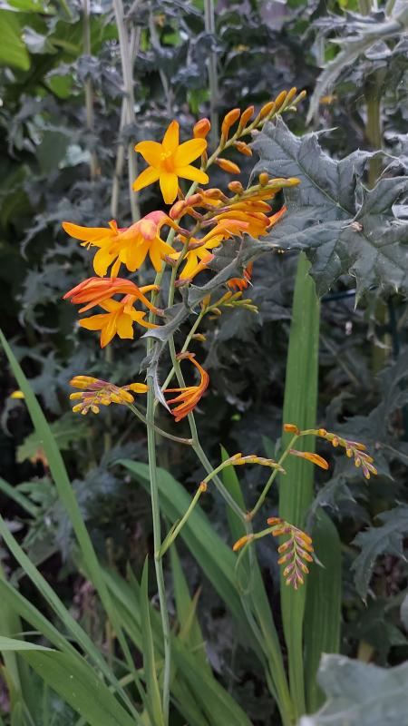 Die meisten gelben Crocosmia scheinen nicht so richtige Wuchsmonster zu sein. Die beiden von Dir gezeigten habe ich auch, und die Größenverhältnisse sind auch bei mir so. 'Norwich Canary' hat es sogar geschafft, rückwärts zu wachsen, und war im dritten Jahr perdü. Crocosmia aurea habe ich gerade erst ausgesät; so richtig reingelb ist die aber auch nicht.
