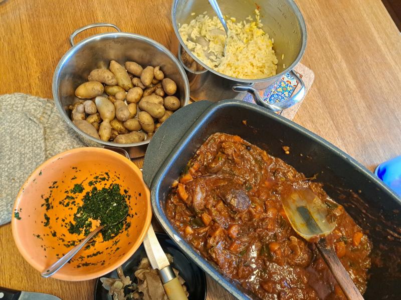 Heute Mittag gab es Werderaner Büffel-Ossobuco (bekam ein Paket Beinscheiben von dort als Dank für Schafscherunterstützung geschenkt 8)) mit Gremolata, Safranreis und/oder Kartoffeln 'La Ratte'. Das Foto ist von nach dem Essen, vorher nicht geschafft :-[ ;D.